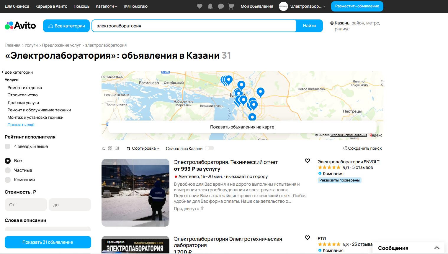 На авито тоже представлено много электролабораторий, соответственно на рейтинг и количество отзывов тут тоже надо обращать внимание.